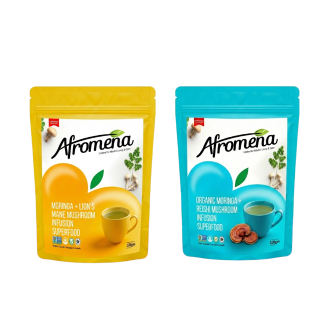 A powerful pair combining Afromena Moringa + Lion’s Mane for focus and mental clarity, with Afromena Moringa + Reishi for calm, immune support, and restoration.